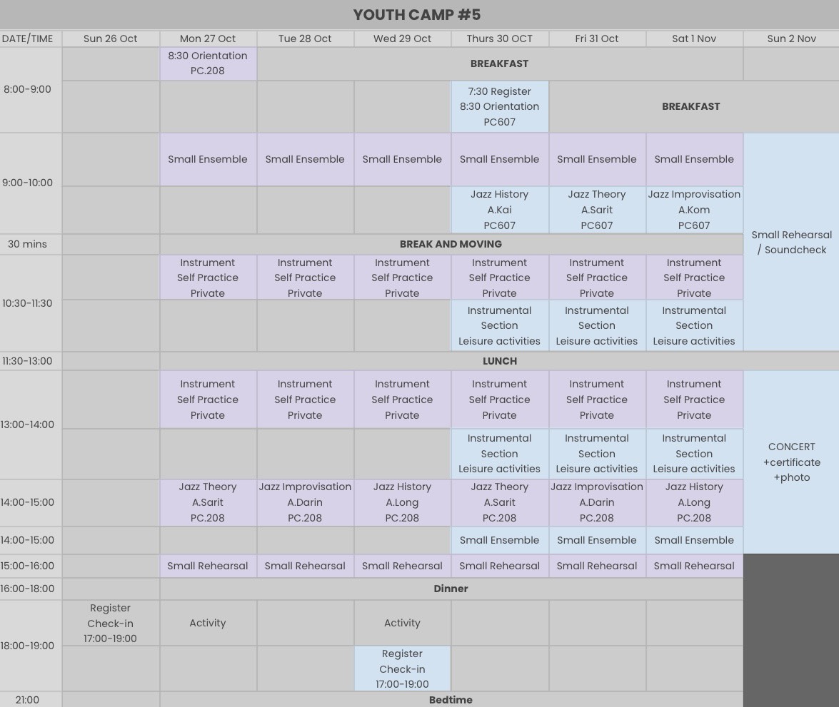 | Fees | 12,000 THB (Pay after the list of applicants is announced and payment is confirmed by October 6, 2025) **We reserve the right not to refund the application fee in any case. Certificate Accommodation fee 3 meals/day (Only October 27-October 31, 2025 For November 1, 2025 There are 2 meals, breakfast and lunch) TIJC Youth Camp shirt #5 Performed at TIJC from 23-25 January 2026 on the Main Stage or Oval Stage. | 3,000 THB (Payment within 24 hours) **We reserve the right not to refund the application fee in any case. Certificate TIJC Youth Camp #5 T-shirt Show on Sunday, November 2, 2025 at the Young Artist Music Program Building, College of Music, Mahidol University |